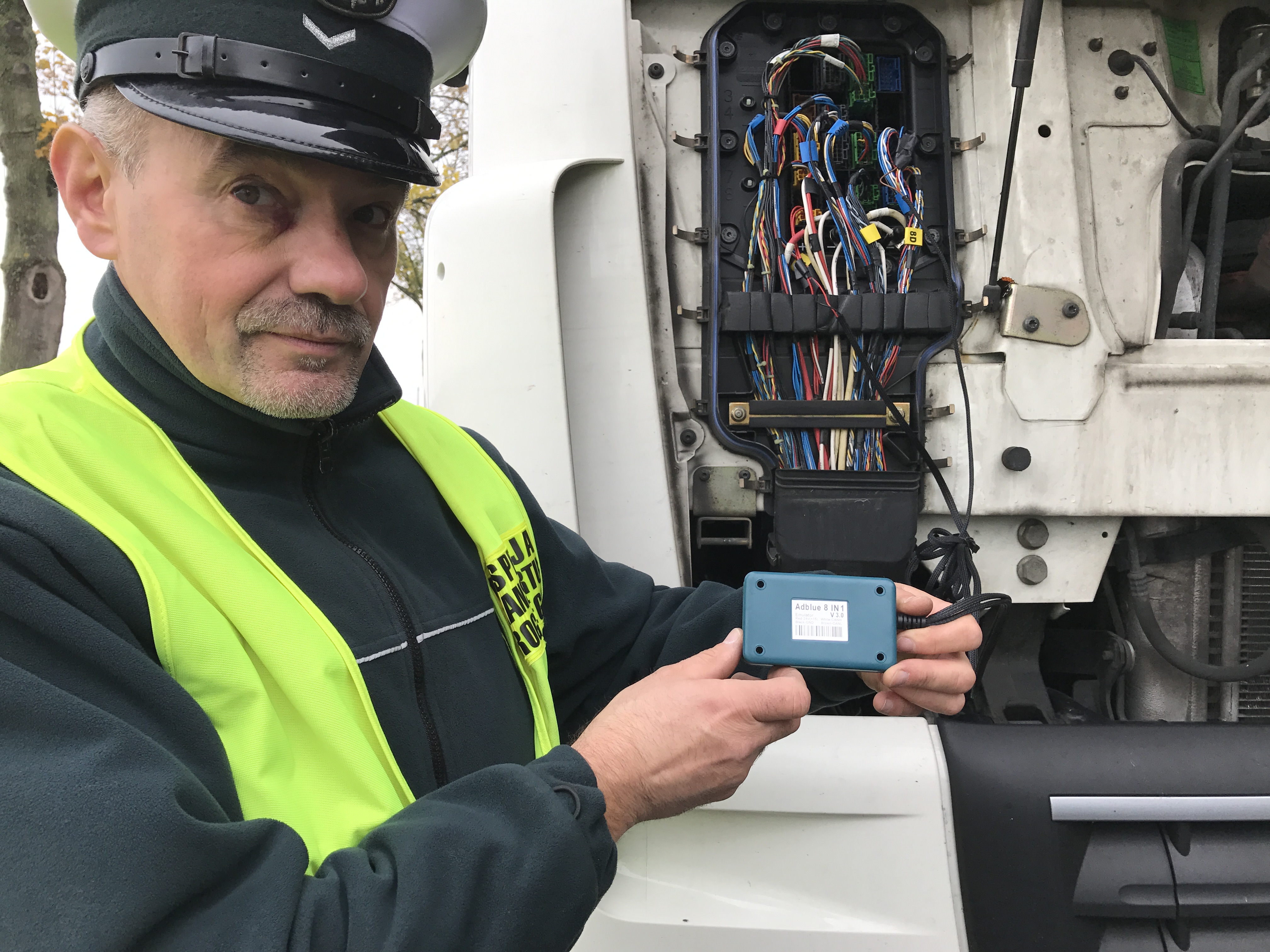 AdBlue ist ein Zusatzstoff, den moderne Dieselmotoren zur Reinigung in die Abgasanlage einspritzen. „Eine absolut saubere Technologie, die LKW besser dastehen lässt als viele moderne Diesel-PKW“, sagt Prof. Thomas Koch vom Karlsruher Institut für Technologie. Doch Adblue kostet Geld, und das wollen kriminelle Speditionen und Fahrer offenbar sparen. Im Internet verkaufen Anbieter aus Asien und Osteuropa Geräte, die dem LKW vorgaukeln, mit AdBlue zu fahren, tatsächlich aber die Anlage schlicht lahmlegen und sogar die Bordelektronik austricksen, so dass bei oberflächlichen Kontrollen nichts Auffälliges zu sehen ist.
